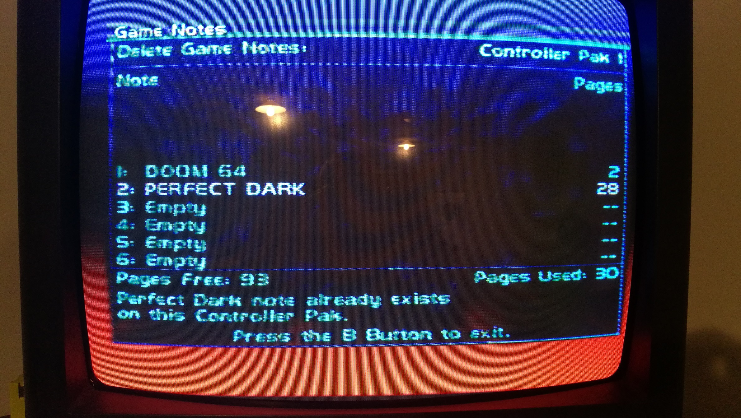 Because the Nintendo 64 doesn’t come with a memory card manager you need to use a game that provides one. In my case I used Perfect Dark. The first time it tries to access the Controller PAK it will say that it is damaged or corrupt. This is normal and select the Attempt Repair option.