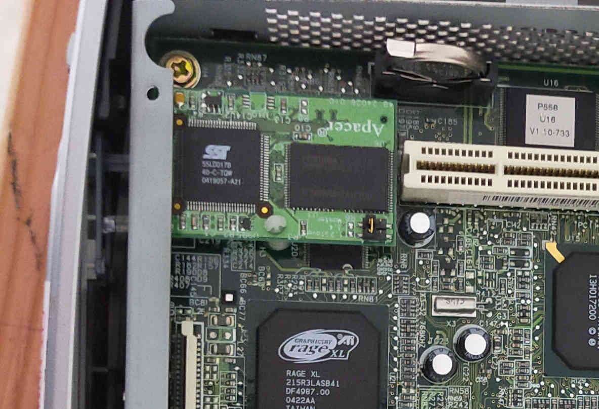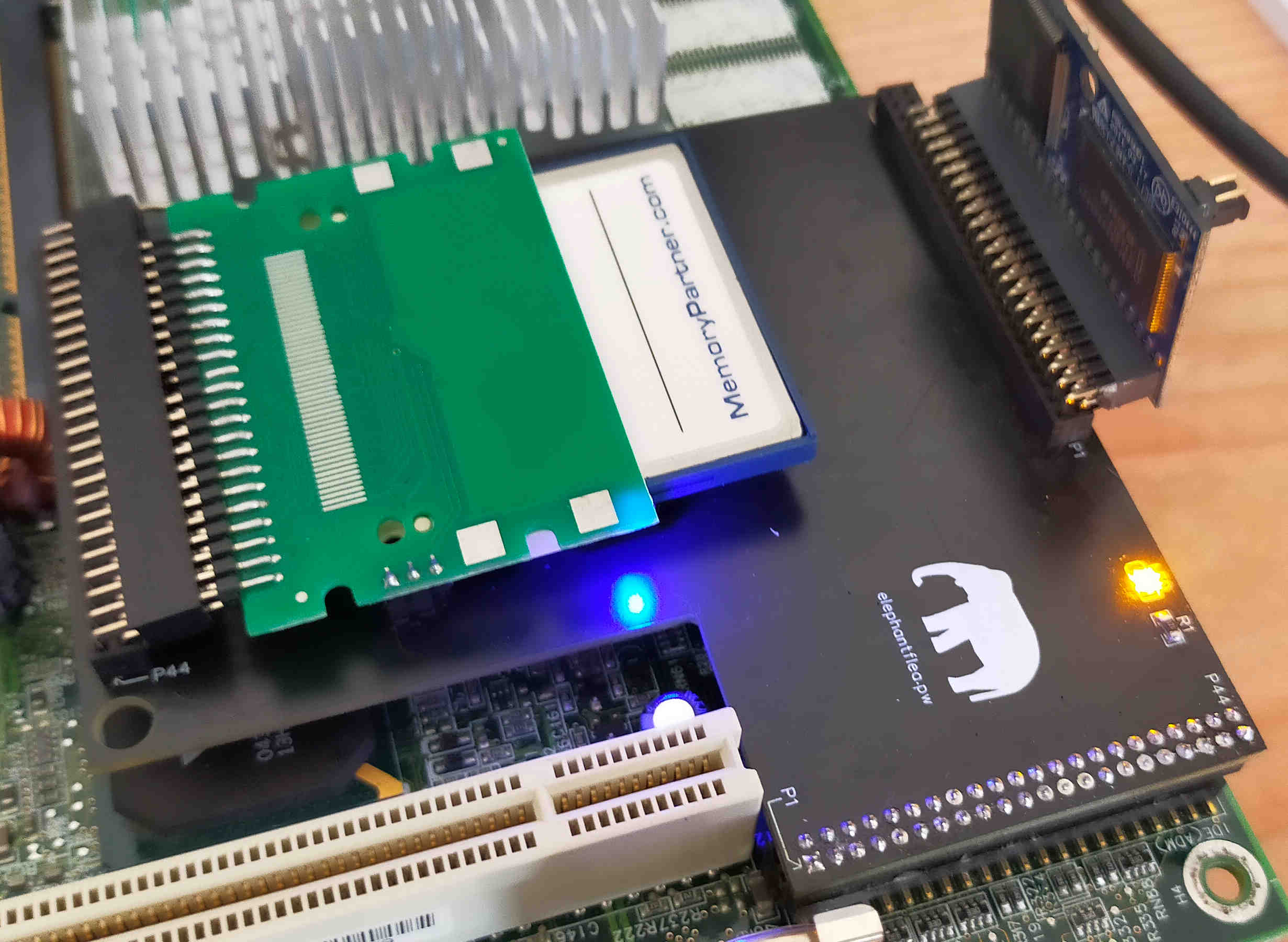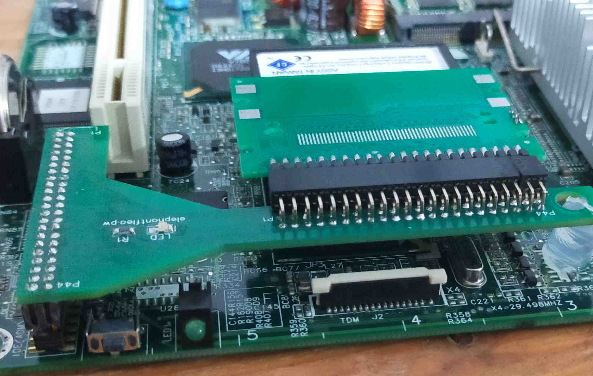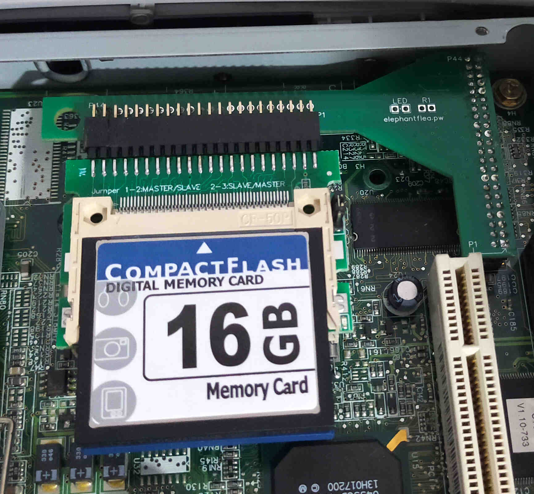The HP Compaq T5500 is a thin client capable of running a variety of retro Windows operating systems. However, for storage it has a single 44 pin mini-IDE connector that has a small amount of flash storage connected to it. To be able to install Windows, a larger drive must be used. An extension must be used for a compact flash or SD card adapter to be able to fit.