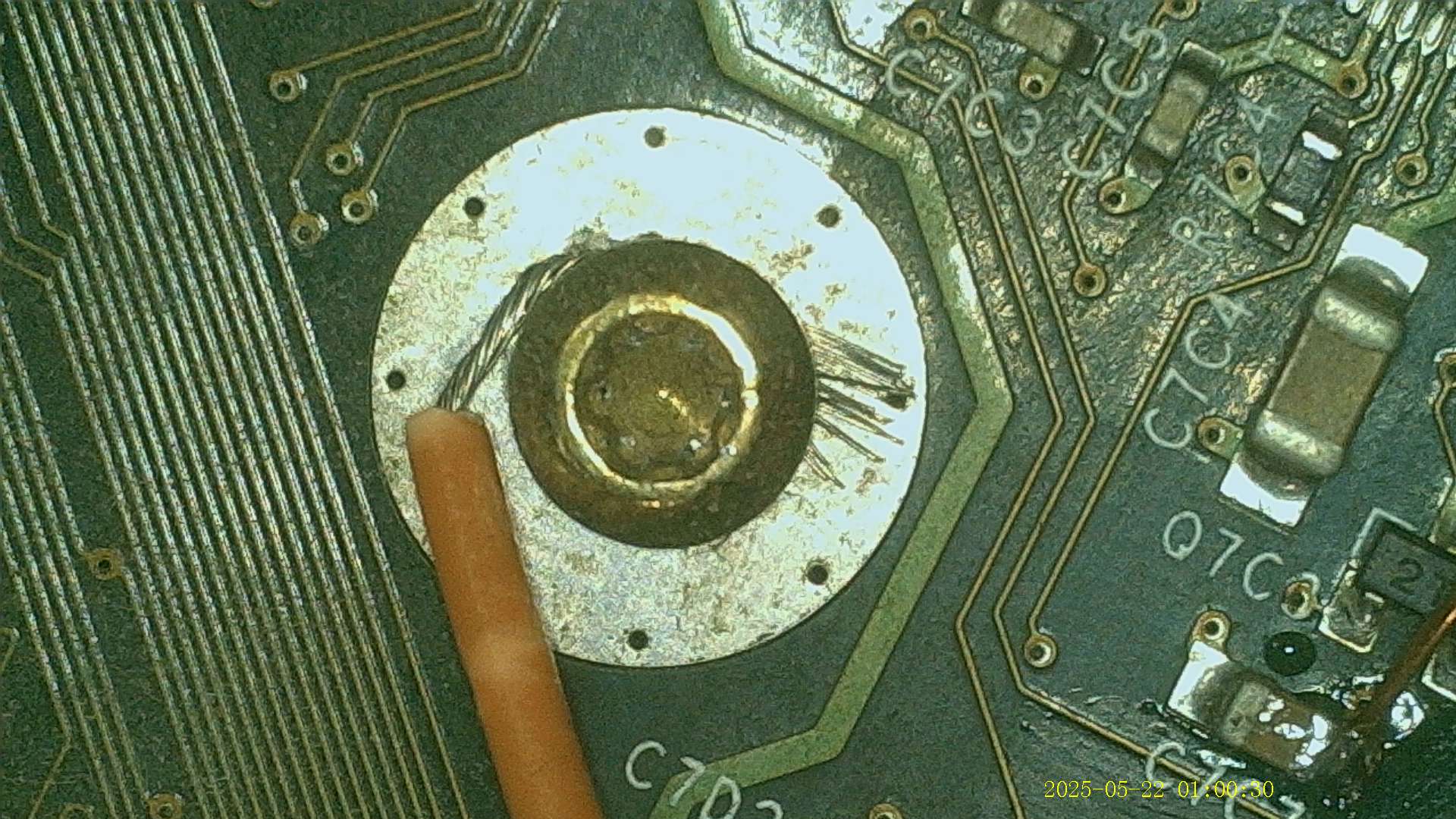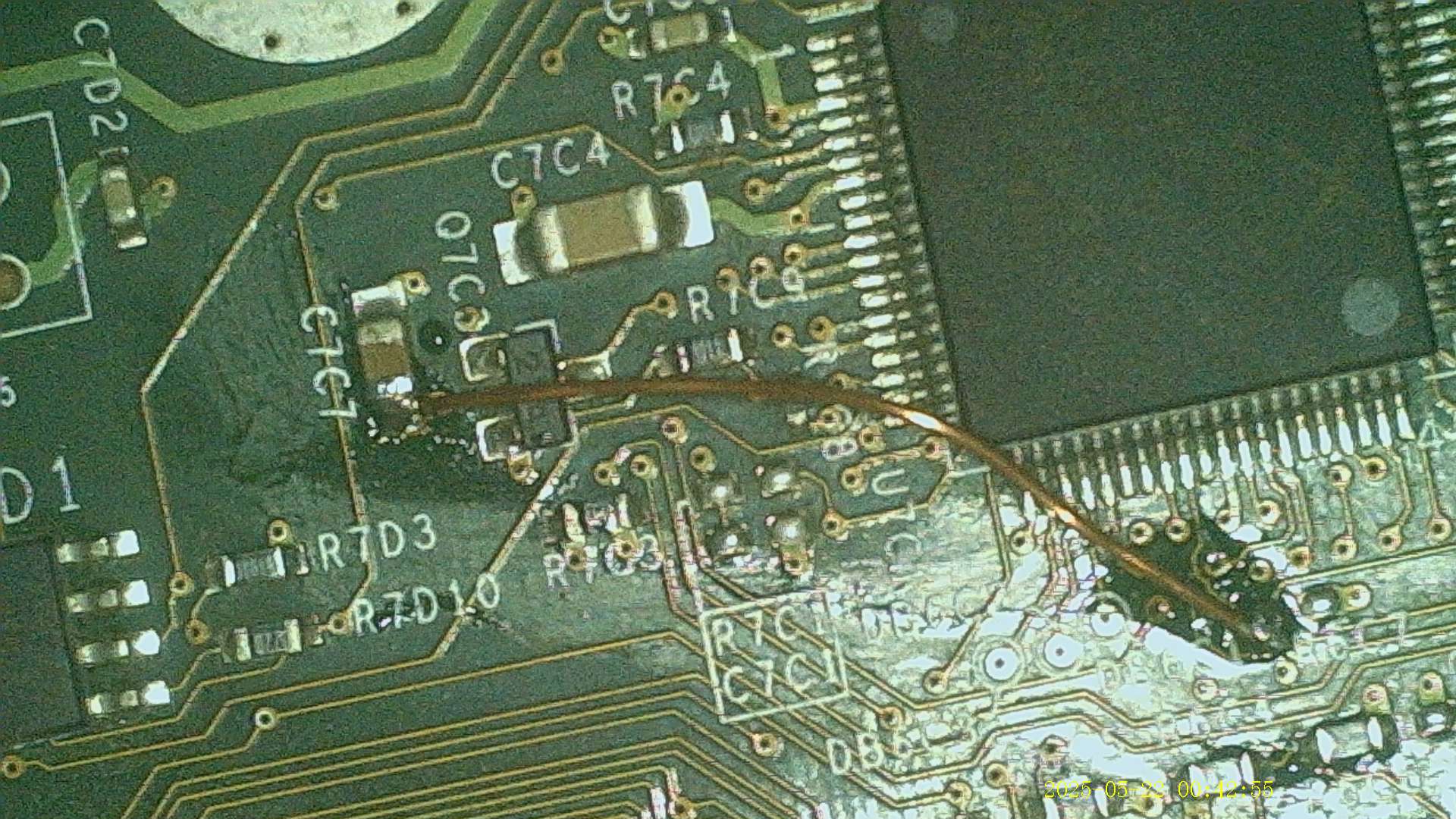The last wire to solder is the Xyclops RXD point. On the top side of the board near the AV port is the component labeled