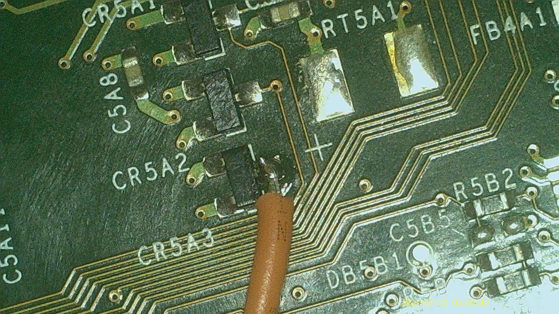CR5A3. The wire needs to be soldered on the right hand pad (the side with a single pad). The other end of this wire